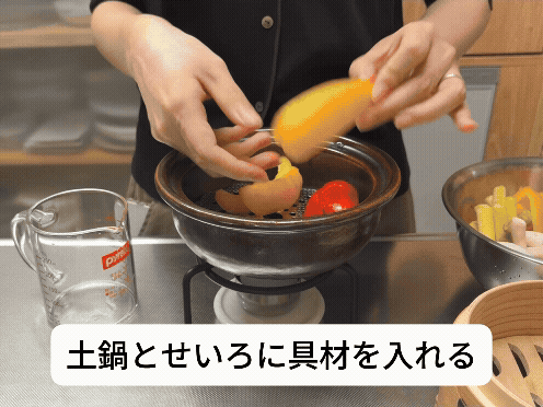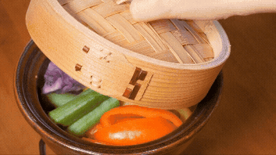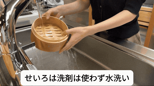 これにより、せいろは常に蒸気にさらされるので、食材はふっくら、ジューシーに仕上がります。