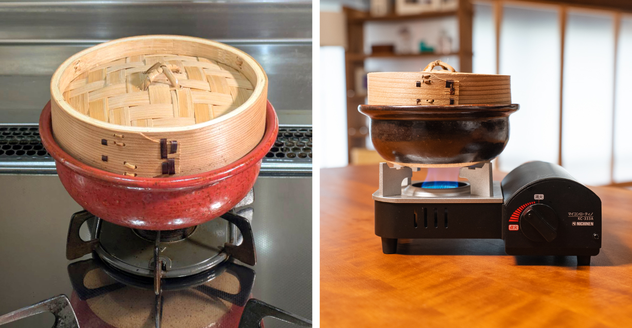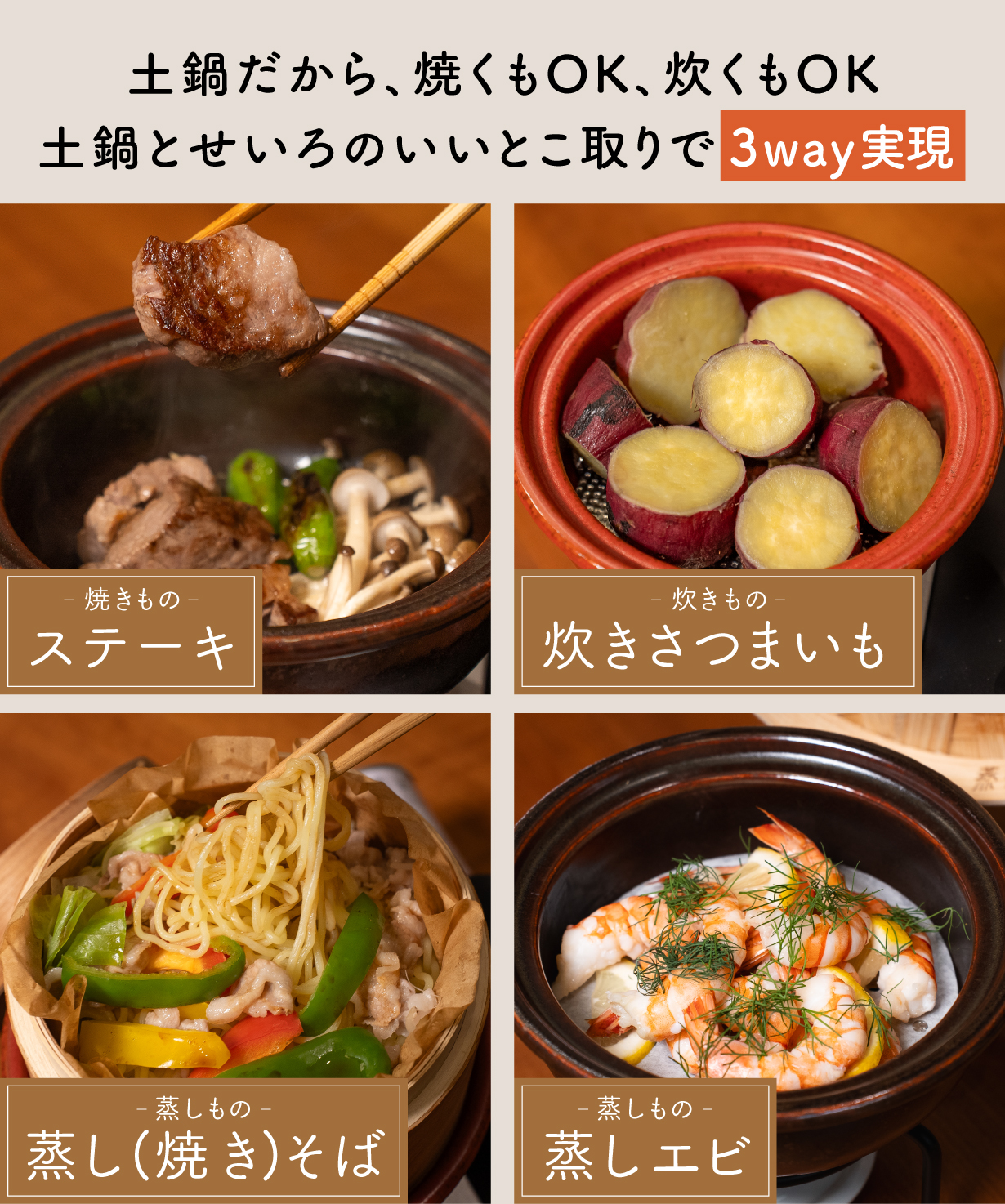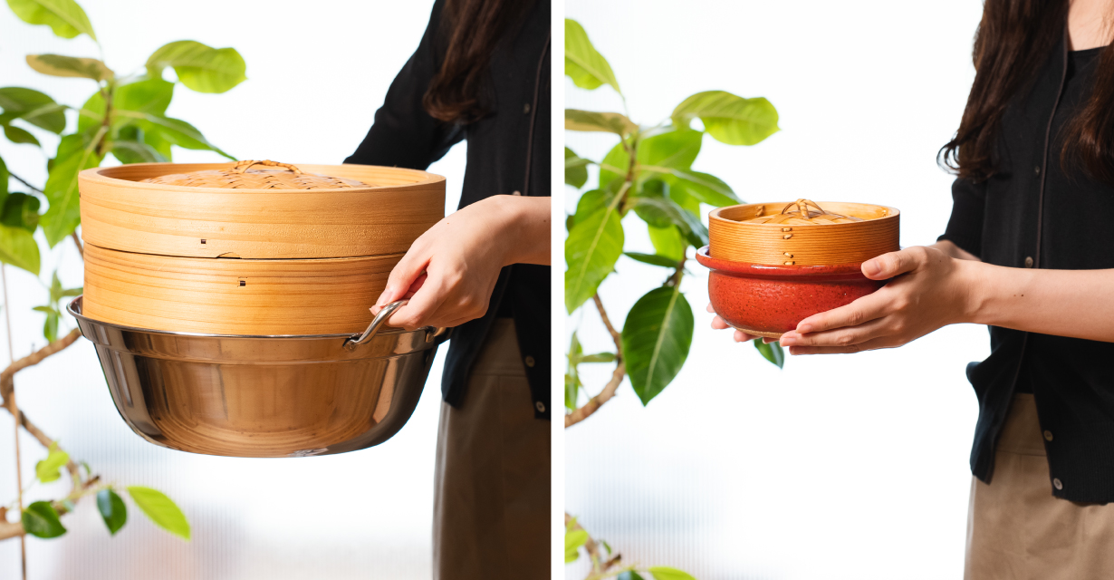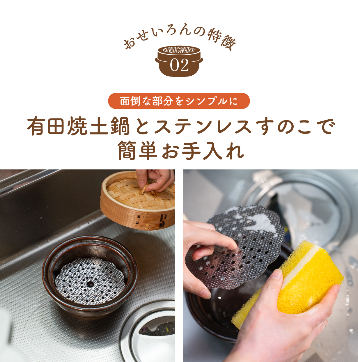 土台を「有田焼土鍋」にし、ステンレスのすのこを入れて使用することで、従来の鍋とせいろの洗い物を減らすことを実現しました。