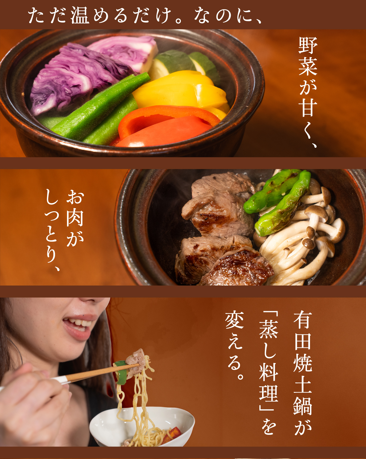 また、「有田焼土鍋」は、熱伝導率が高く、遠赤外線効果でじっくりと火が入り、ふっくら、しっとりとした出来上がりに。