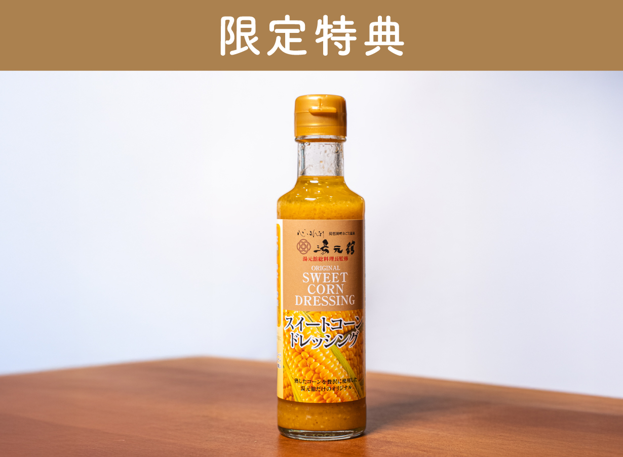 この『スイートコーン ドレッシング』はお客様のご要望にお応えし、ご家庭用にと商品化された湯元舘だけのオリジナルドレッシングです。
